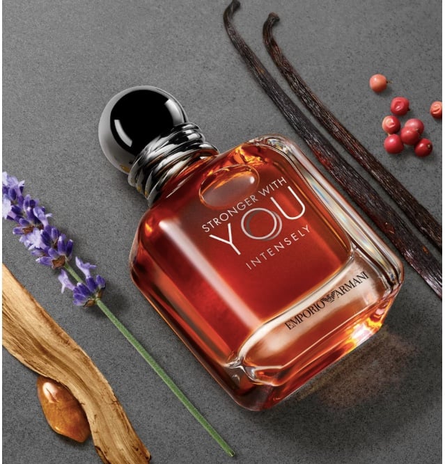 Stronger With You Intensely from Emporio Armani is an oriental-woody fragrance with fougère accents. Inspired by the excitement of new love, this addictive scent is based around a warm vanilla heart enhanced by vibrant notes of amber wood and pink pepper. Continuing the romantic theme, the cap of the bottle is based on the rings Giorgio Armani wears on the third finger of his left hand; one ring was worn by Giorgio himself and one by his partner, Sergio Galeotti
